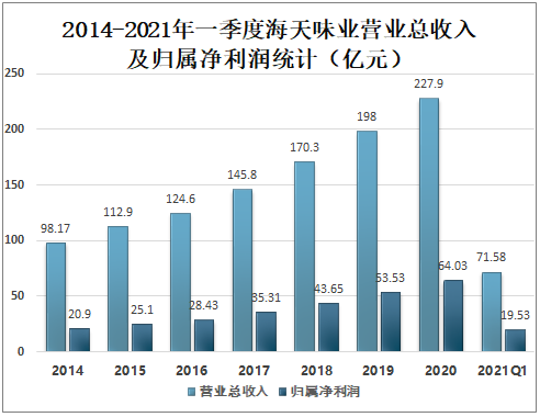 4月29日海天味业发布2021年一季报,报告期内实现营收71.58亿元,同比+21.65%;实现归母净利润19.53亿元,同比+21.13%,基本EPS为0.6元。