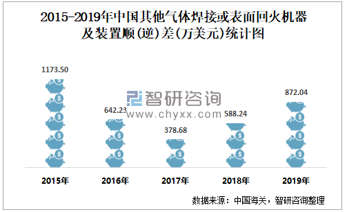 2015-2019年中国其他气体焊接或表面回火机器及装置顺逆差统计图