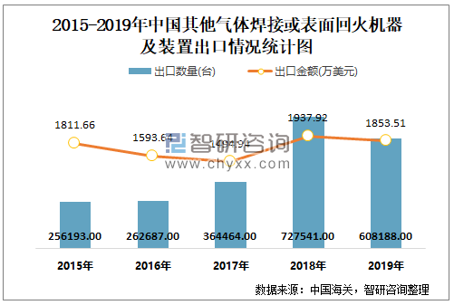 2015-2019年中国其他气体焊接或表面回火机器及装置出口情况统计图
