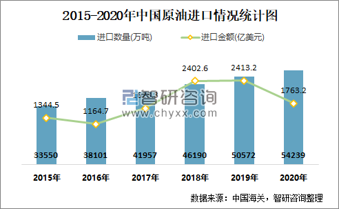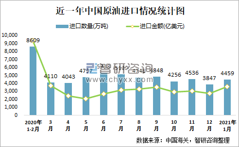 根据中国海关数据显示:2021年1月中国原油进口数量为4459万吨,同比下降3.3%,进口金额为161.28亿美元,同比下降29.6%;2015-2020年中国原油进口数量逐年递增。