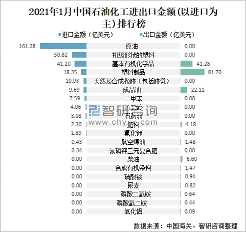 2021年1月中国石油化工进出口金额(以进口为主)排行榜