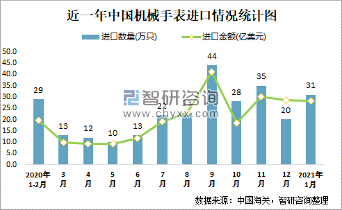 根据中国海关数据显示:2021年1月中国机械手表进口数量为31万只,同比增长51.7%,进口金额为3.38亿美元,同比增长133.7%;2015-2020年中国机械手表进口数量与进口金额均在2016年跌至最低值,此后逐年递增。