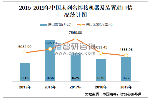 2015-2019年中国未列名焊接机器及装置进口情况统计图