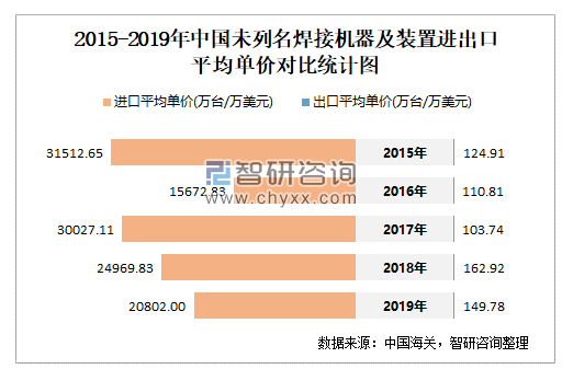 2015-2019年中国未列名焊接机器及装置进出口平均单价对比统计图