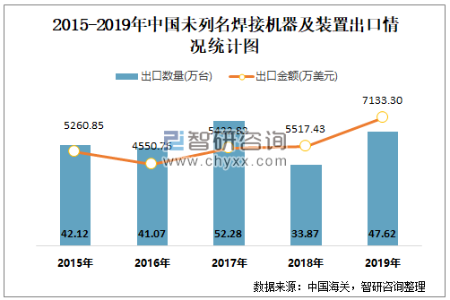 2015-2019年中国未列名焊接机器及装置出口情况统计图