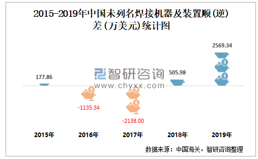 2015-2019年中国未列名焊接机器及装置顺逆差统计图
