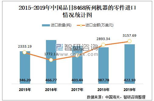 2015-2019年中国品目8468所列机器的零件进口情况统计图