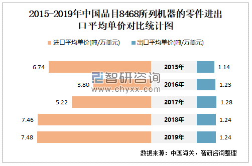 2015-2019年中国品目8468所列机器的零件进出口平均单价对比统计图
