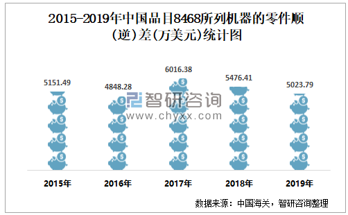 2015-2019年中国品目8468所列机器的零件顺逆差统计图