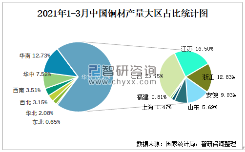 根据国家统计局数据显示:2021年1-3月中国铜材主要集中在华东、华南、华中地区生产;2021年1-3月中国铜材产量大区分布不均衡,其中华东地区产量最高,特别是江西省贡献了最多产量;2021年1-3月中国铜材各省市产量呈现梯队式分布,江西、江苏、浙江等省产量较多。