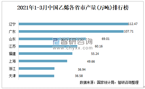 2021年1-3月中国乙烯各省市产量排行榜