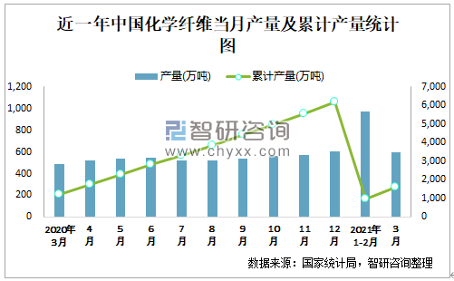 根据国家统计局数据显示:2021年3月中国化学纤维产量为597万吨,同比增长20.7%;2021年1-3月中国化学纤维累计产量为1580.4万吨,累计增长27.1%;2015-2020年中国化学纤维产量总体呈上升趋势。