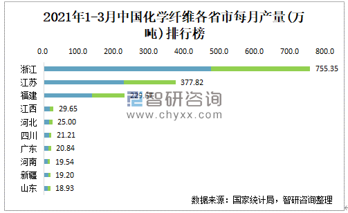 2021年1-3月中国化学纤维各省市每月产量排行榜