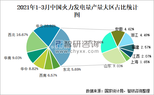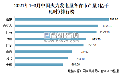 根据国家统计局数据显示:2021年1-3月中国火力发电量主要集中在华东、华北、西北地区生产;2021年1-3月中国火力发电量产量大区分布不均衡,其中华东地区产量最高,特别是山东省贡献了最多产量;2021年1-3月中国火力发电量各省市产量呈现梯队式分布,山东、内蒙古自治区、江苏等省产量较多。