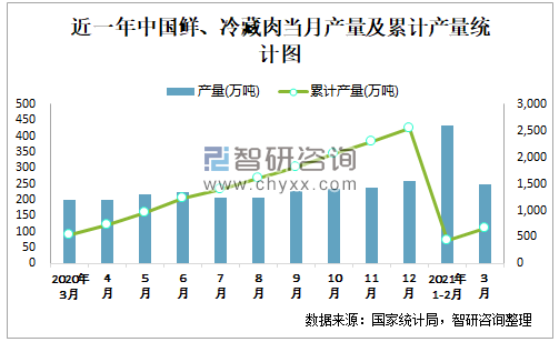 根据国家统计局数据显示:2021年3月中国鲜、冷藏肉产量为249万吨,同比增长18.3%;2021年1-3月中国鲜、冷藏肉累计产量为668.2万吨,累计增长19.4%;2015-2020年中国鲜、冷藏肉产量总体呈下降趋势。