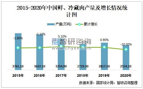 2015-2020年中国鲜、冷藏肉产量及增长情况统计图