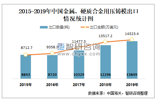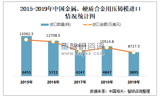 根据中国海关数据显示:2019年1-12月中国金属、硬质合金用压铸模进口数量为3894.98吨,进口金额为8727.27万美元;2019年1-12月金属、硬质合金用压铸模出口数量为13849吨,出口金额为14323.43万美元。