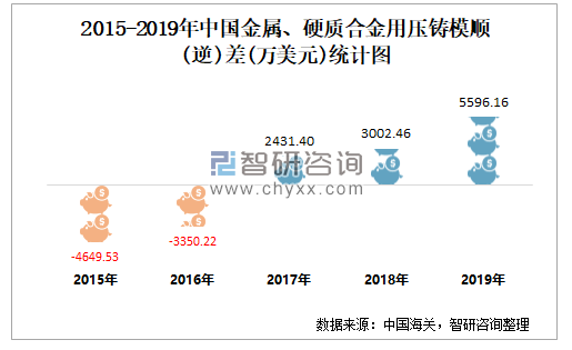 2015-2019年中国金属、硬质合金用压铸模顺(逆)差统计图