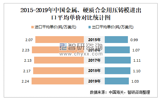 2015-2019年中国金属、硬质合金用压铸模进出口平均单价对比统计图