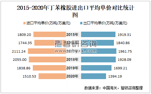 2015-2020年丁苯橡胶进出口平均单价对比统计图
