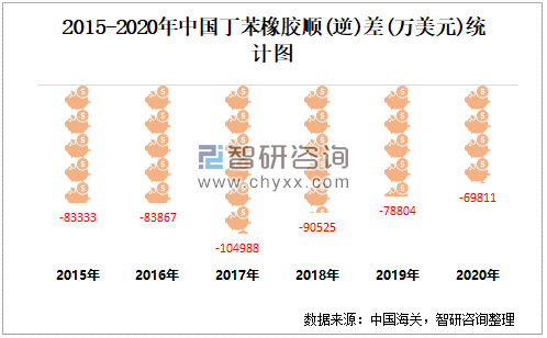 2015-2020年中国丁苯橡胶顺(逆)差(万美元)统计图