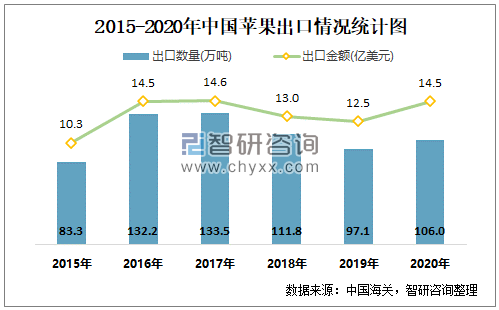 2015-2020年中国苹果出口情况统计图