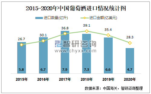 2015-2020年中国葡萄酒进口情况统计图