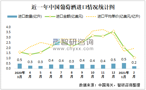 根据中国海关数据显示:2021年2月中国葡萄酒进口数量为0.2亿升,同比下降28.5,进口金额为1.1亿美元,同比下降22.9%;2021年1-2月中国葡萄酒进口数量为0.79亿升,同比增长0.2%,进口金额为3.15亿美元,同比下降9.7%;近一年中国葡萄酒进口均价涨跌幅度较大,2月进口均价高于1月;2015-2020年中国葡萄酒进口数量在2017年达到最高值,此后逐年递减。