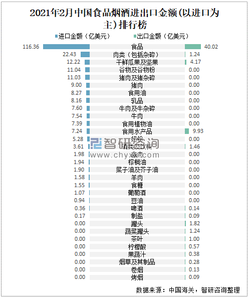 2021年2月中国食品烟酒进出口金额(以进口为主)排行榜