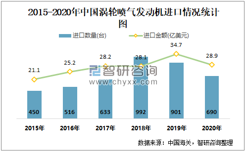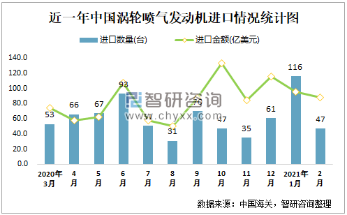 根据中国海关数据显示:2021年2月中国涡轮喷气发动机进口数量为47台,同比下降9.6,进口金额为2.52亿美元,同比增长59.8%;2021年1-2月中国涡轮喷气发动机进口数量为163台,同比增长44.2%,进口金额为5.23亿美元,同比增长0.5%;2015-2020年中国涡轮喷气发动机进口金额在2019年达到最高值,此后小幅度下滑。