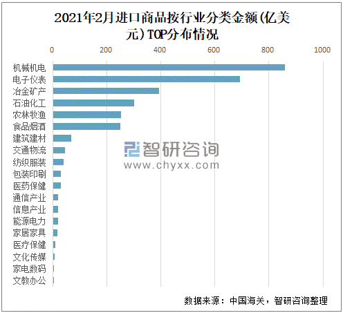 2021年2月进口商品按行业分类金额(亿美元)TOP分布情况