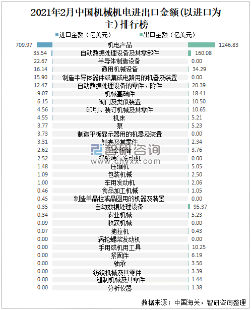2021年2月中国机械机电进出口金额(以进口为主)排行榜