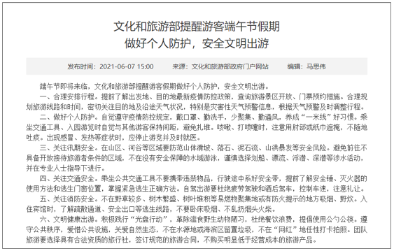 端午节即将来临,文化和旅游部提醒游客假期做好个人防护,安全文明出游。