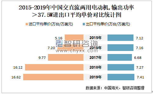 2015-2019年中国交直流两用电动机,输出功率>37.5W进出口平均单价对比统计图
