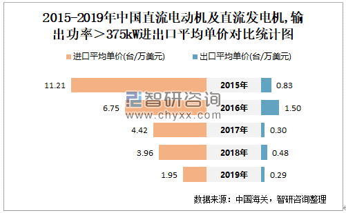 2015-2019年中国直流电动机及直流发电机,输出功率>375KW进出口平均单价对比统计图