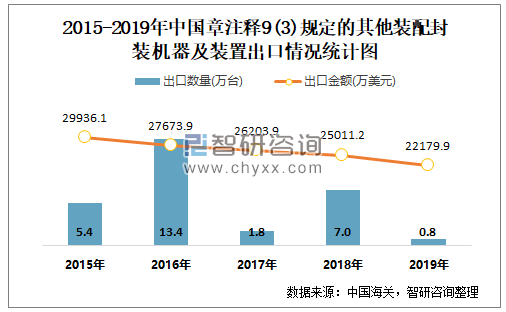 2015-2019年中国章注释9(3)规定的其他装配封装机器及装置出口情况统计图
