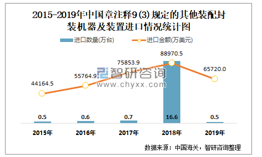 根据中国海关数据显示:2019年1-12月中国章注释9(3)规定的其他装配封装机器及装置进口数量为0.45万台,进口金额为65720.02万美元;2019年1-12月章注释9(3)规定的其他装配封装机器及装置出口数量为0.8万台,出口金额为22179.88万美元。