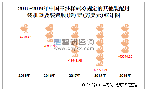2015-2019年中国章注释9(3)规定的其他装配封装机器及装置顺(逆)差统计图