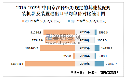 2015-2019年中国章注释9(3)规定的其他装配封装机器及装置进出口平均单价对比统计图