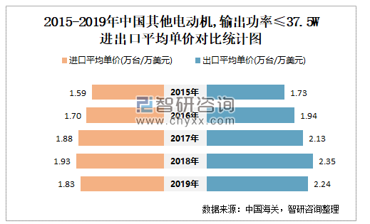 2015-2019年中国其他电动机,输出功率≤37.5W进出口平均单价对比统计图