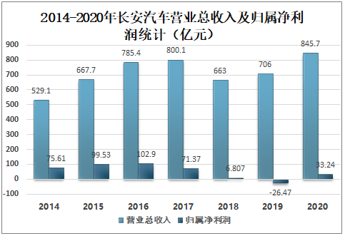2014-2020年长安汽车营业总收入及归属净利润统计(亿元)