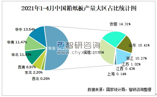 根据国家统计局数据显示:2021年1-4月中国箱纸板主要集中在华东、华中、华南地区生产;2021年1-4月中国箱纸板产量大区分布不均衡,其中华东地区产量最高,特别是福建省贡献了最多产量;2021年1-4月中国箱纸板各省产量呈现梯队式分布,福建、安徽、广东等省产量最多。