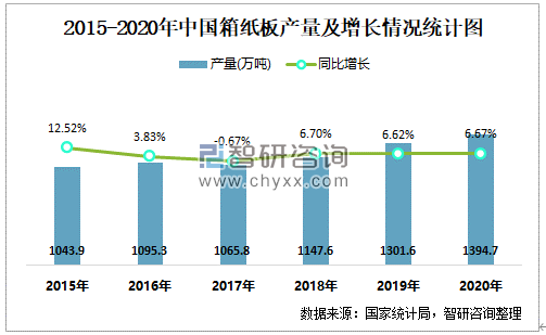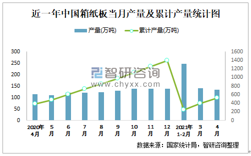 根据国家统计局数据显示:2021年4月中国箱纸板产量为135万吨,同比增长18.7%;2021年1-4月中国箱纸板累计产量为524.1万吨,同比增长39.69%;2015-2020年中国箱纸板产量总体呈现上升趋势,2020年达到最高。