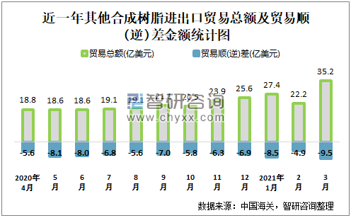根据中国海关数据显示:2021年3月中国其他合成树脂进出口贸易总额为35.23亿美元,贸易逆差为9.5亿美元;2021年1-3月中国其他合成树脂累计进出口贸易总额为84.87亿美元,同比增长40.3%,累计贸易逆差为22.88亿美元,同比增长52.4%。