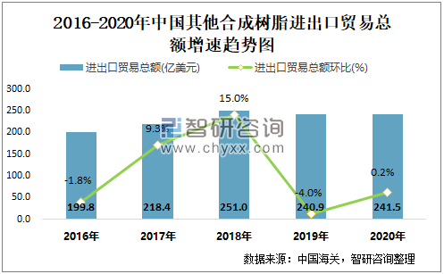 2016-2020年中国其他合成树脂进出口贸易总额增速趋势图