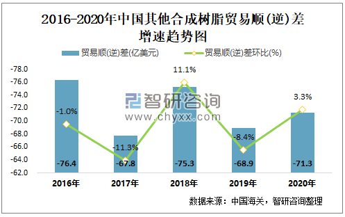 2016-2020中国其他合成树脂贸易顺(逆)差增速趋势图