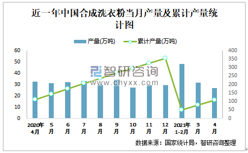 近一年中国合成洗衣粉当月产量及累计产量统计图