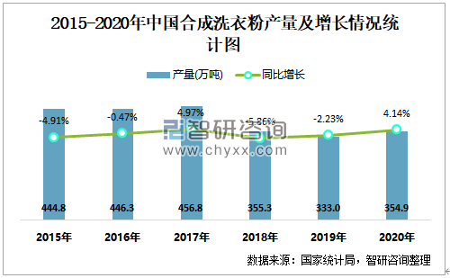 2015-2020年中国合成洗衣粉产量及增长情况统计图