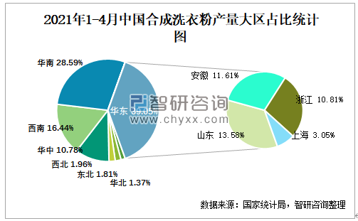 2021年1-4月中国合成洗衣粉产量大区占比统计图