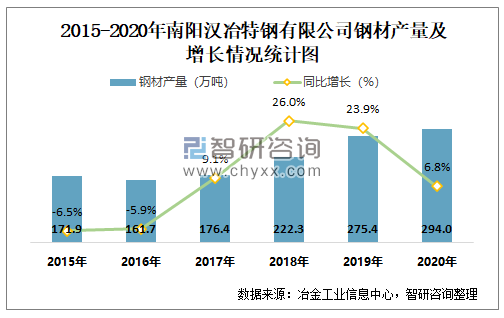2015-2020年南阳汉冶特钢有限公司钢材产量及增长情况统计图